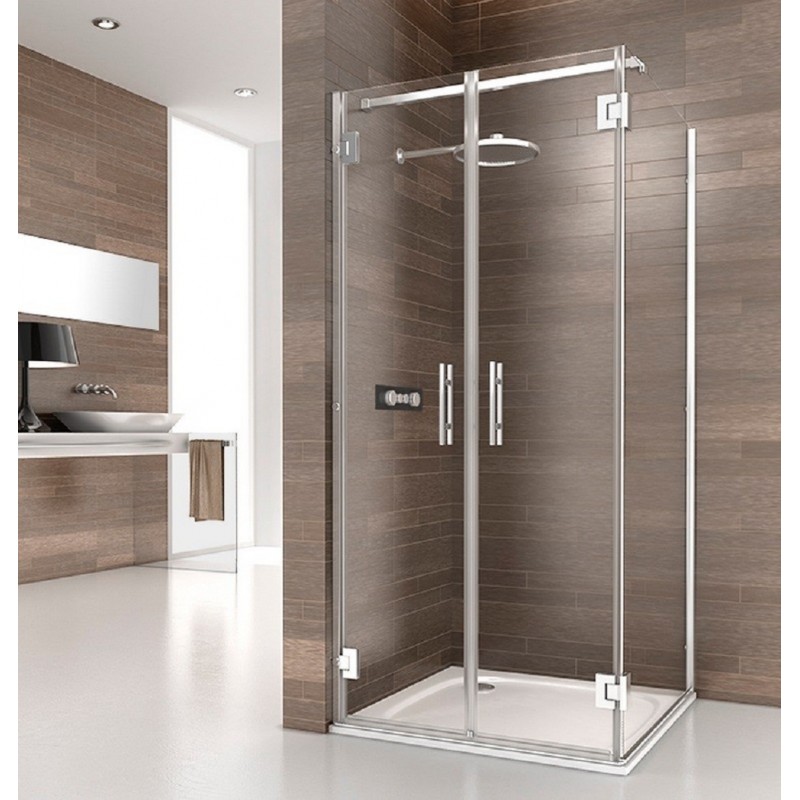 Mampara de ducha de vidrio securizado y acero inoxidable con dos puertas vaivén.