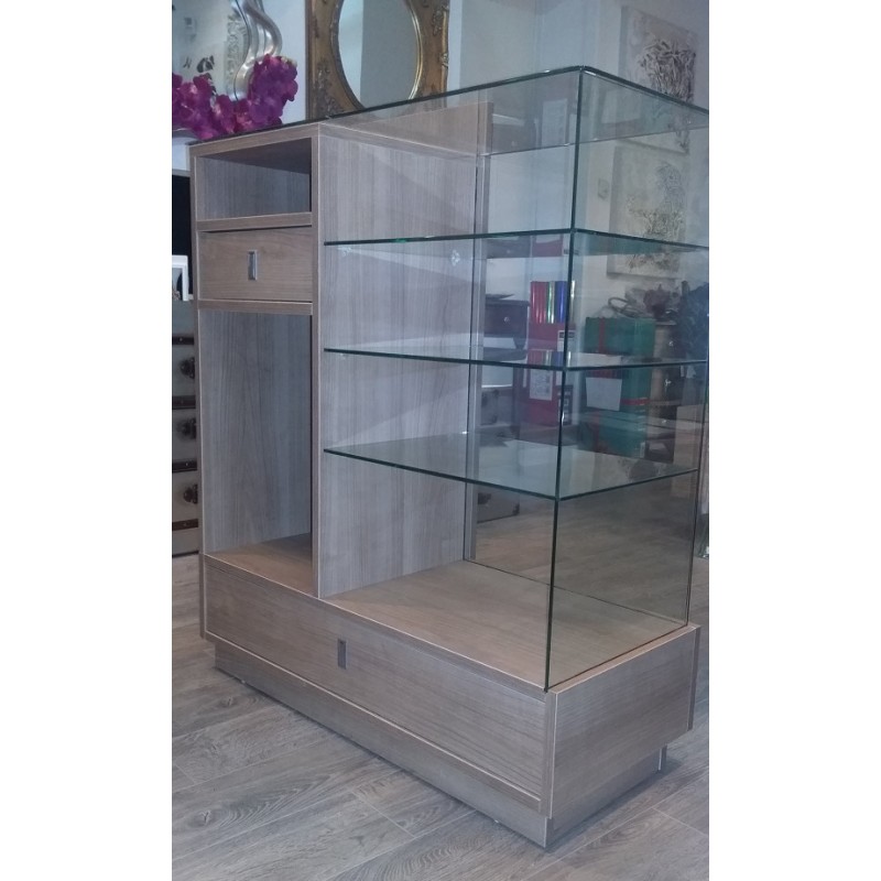 Mostrador para tienda con expositor acristalado con baldas y espacio para ordenador, cajón monedero cajón pequeño y cajón ancho. Tapa de cristal.