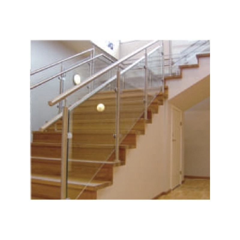 Escalera con peldaños de madera y balaustre de acero y cristal.