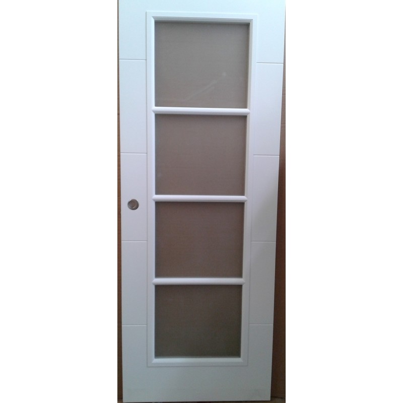 Hoja de puerta de paso lacada en blanco. Vidriera 4V con 4 cristales mate. Medidas hoja 202 x 72cm.